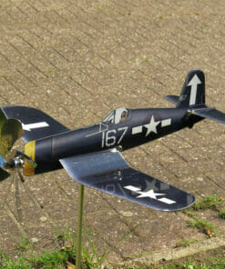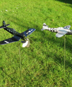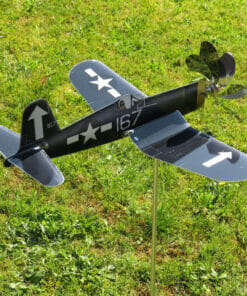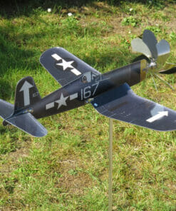 The Corsair F4U is one of the most iconic aircraft in the world. To implement the power of its beefy double radial engine, it has a huge propeller. So that the prop didn’t touch the ground, the wings were simply given the well-known wing kink in order to set the propeller axis higher. We have also implemented the powerful propeller in the maxFlite wind spinner aircraft. And yes, it catches a fair amount of wind and lets the Corsair windmill ‘fly’ powerfully through your garden.