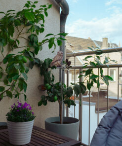 The owl is enthroned on an aluminum pole, which is also included in the scope of delivery, as are illustrated assembly instructions, a rotary ball bearing and the ball-bearing propeller at the front. The wind turbine to decorate your balcony or garden can be set up within a few minutes. Tucked into the garden floor or attached to the balcony with cable ties, it will delight every animal lover who discovers it.