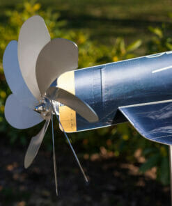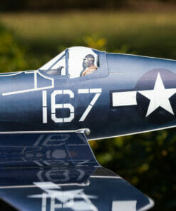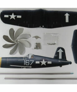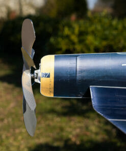 Die Corsair F4U ist eines der markantesten Flugzeuge der Welt. Um die Leistung Ihres bulligen Doppelsternmotors umzusetzen, hat sie einen riesigen Propeller. Damit der nicht den Boden berührte, bekamen die Flügel einfach den bekannten Flügelknick um damit die Propellerachse höher zu setzen. Den mächtigen Propeller haben wir auch beim maxFlite Windradflugzeug umgesetzt. Und ja, der fängt ordentlich viel Wind ein und lässt so die Windrad Corsair kraftvoll durch Ihren Garten ‚fliegen‘.