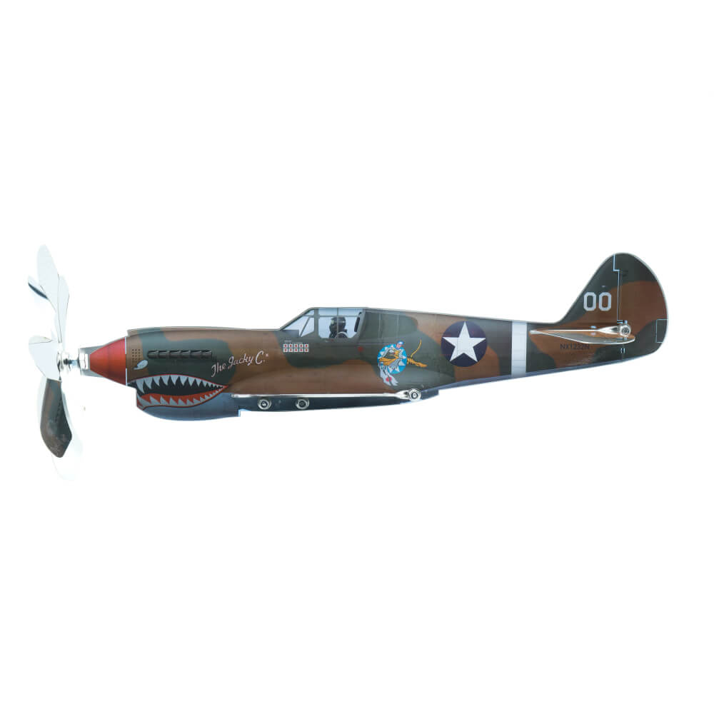 Die P-40 Kittyhawk (US Bezeichnung: „Warhawk“) ist ein formschöner Jäger der seinen Erstflug 1938 hatte. Ihre Bühne waren vor allem der Pazifik und Nordafrika. Auf Schauplätzen im Nordwesten Europas wurde sie wegen der Unterlegenheit gegenüber der Me-109 oder FW 190 wenig eingesetzt. maxFlite hat das Farbschema der bekannten „Jacky C II“ mit Ihrem weit aufgerissenen Haifischmaul voller Reißzähne gewählt. Exakt diese Maschine ist Original im American Airpower Museum in New York zu bewundern. Die attraktive P-40 als „Gardenfighter“ sollte auch in Ihrer persönlichen maxFlite Sammlung nicht fehlen.